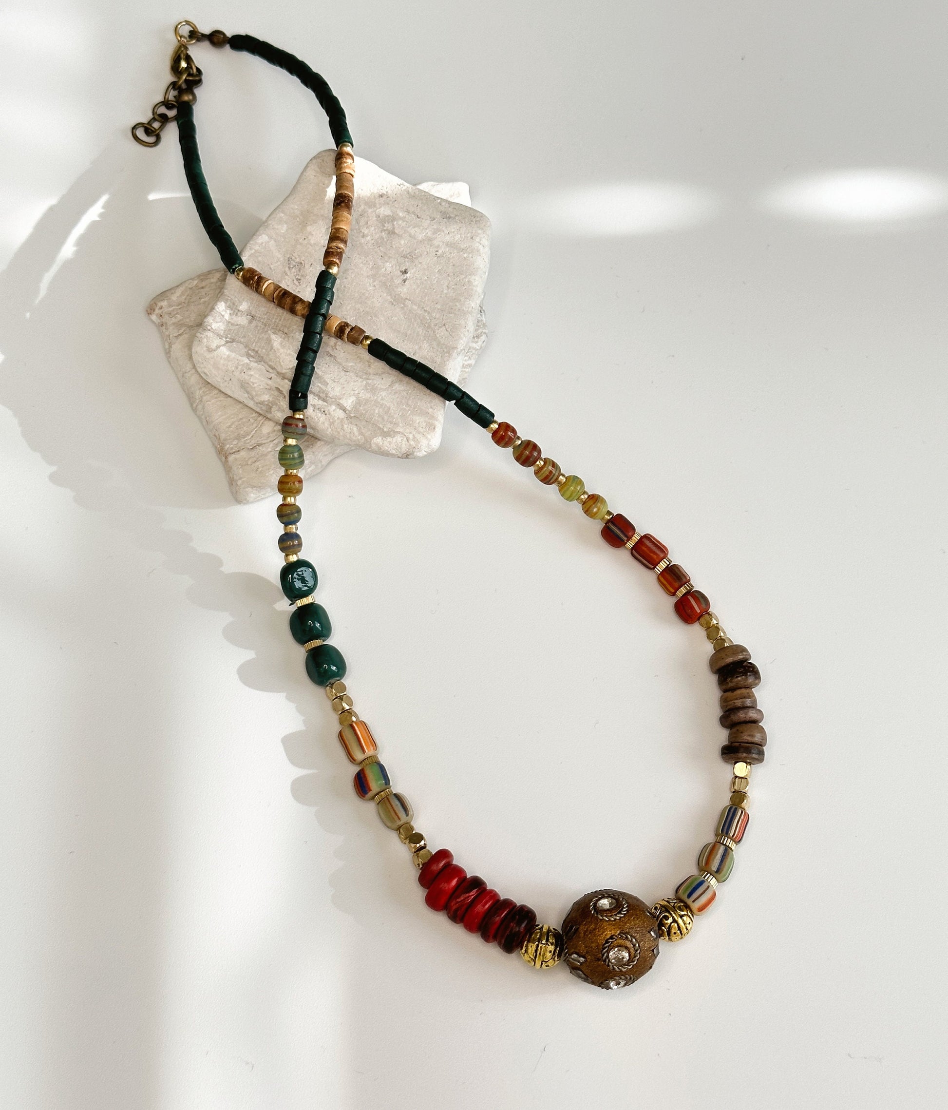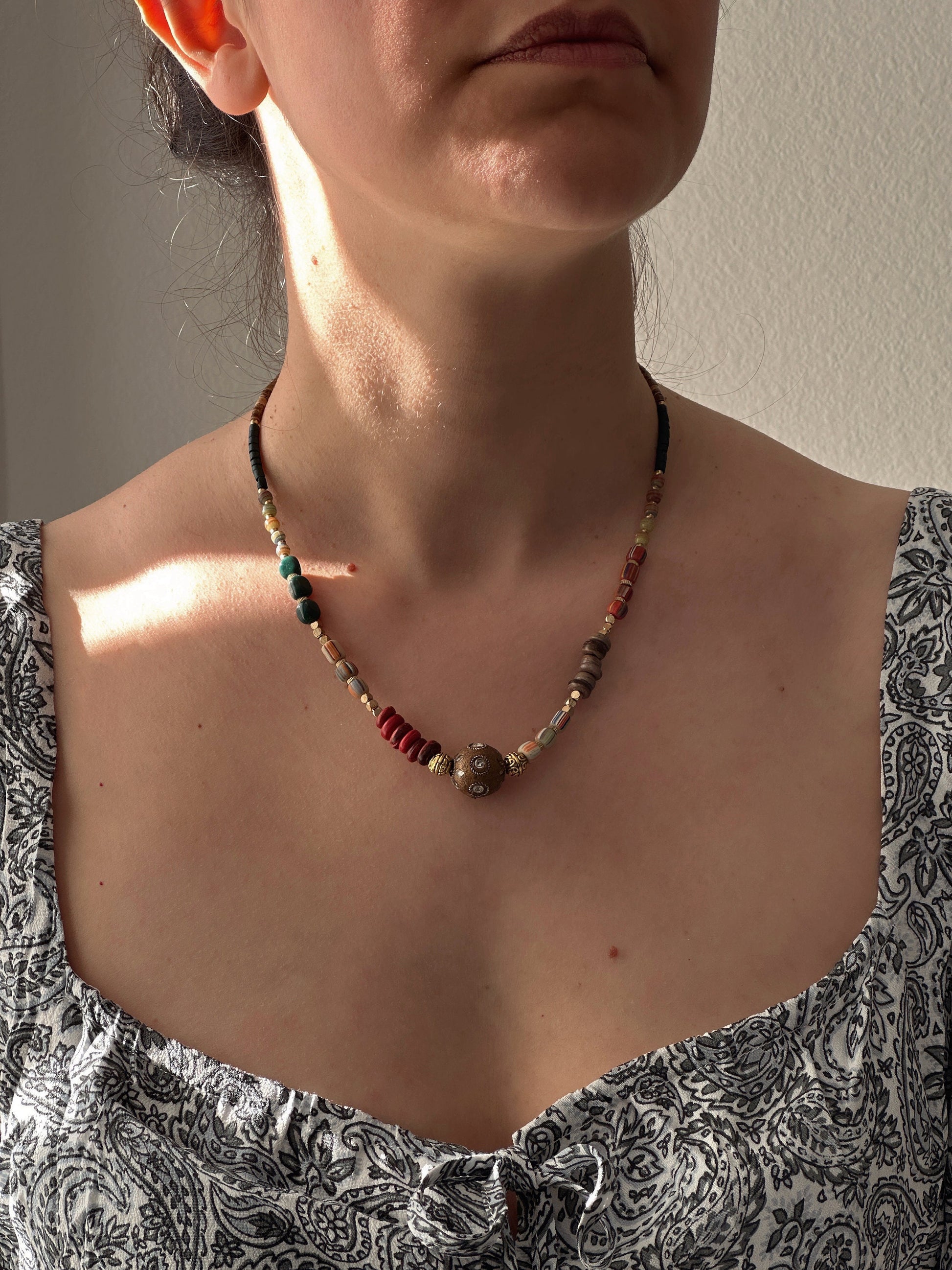 Its ethnicity and elegance comes from the traditional tribal ethnic design and boho minimalist string structure. It is designed and produced by local shaman artisans. Shamanism is known as a nature worship belief. Shamans bound their soul with nature. Our necklace is designed and is became alive with this bound.