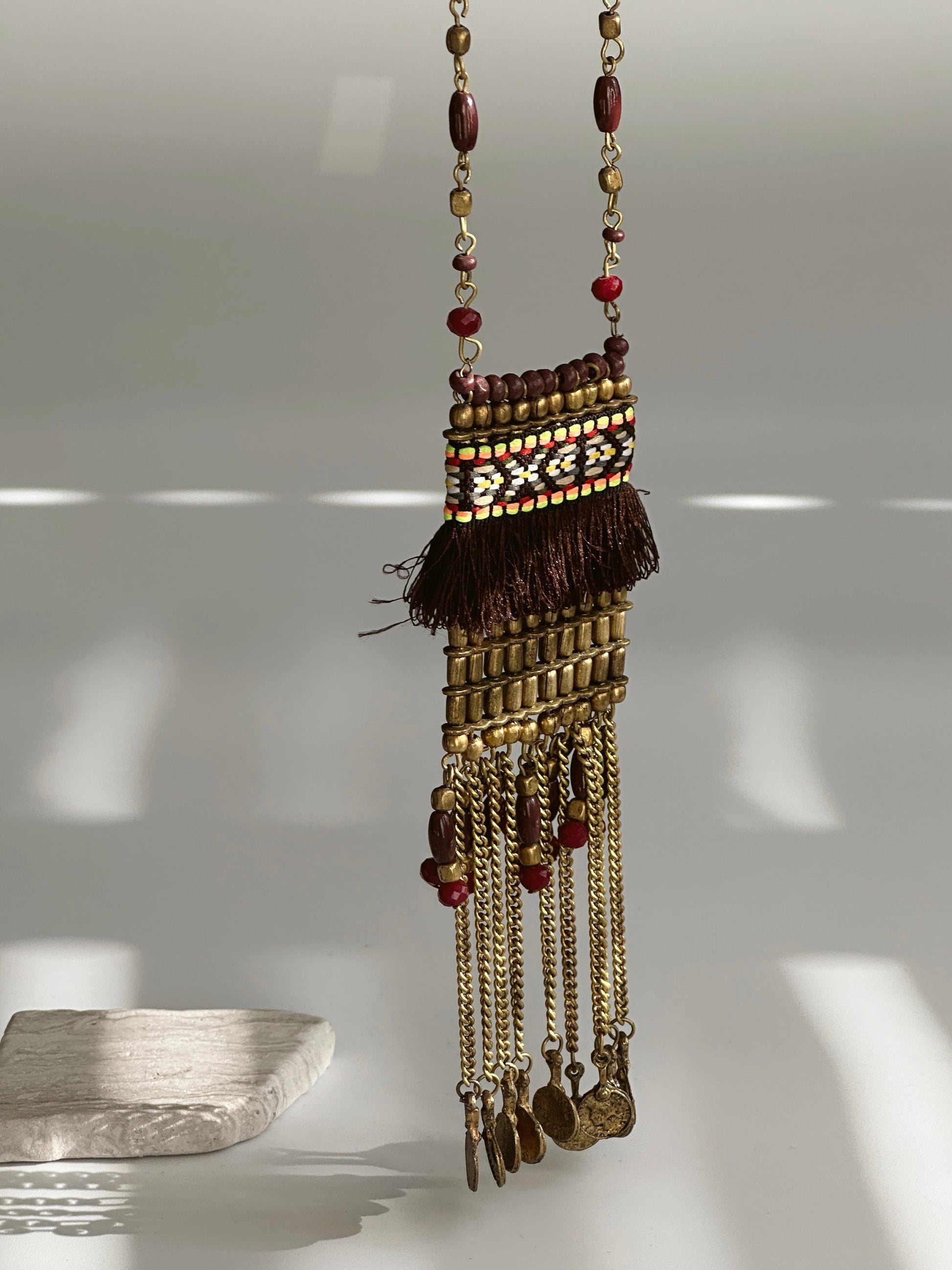Its ethnicity and elegance comes from the traditional tribal ethnic design and boho minimalist string structure. It is designed and produced by local shaman artisans. Shamanism is known as a nature worship belief. Shamans bound their soul with nature. Our necklace is designed and is became alive with this bound.