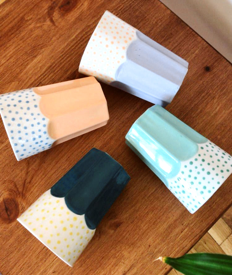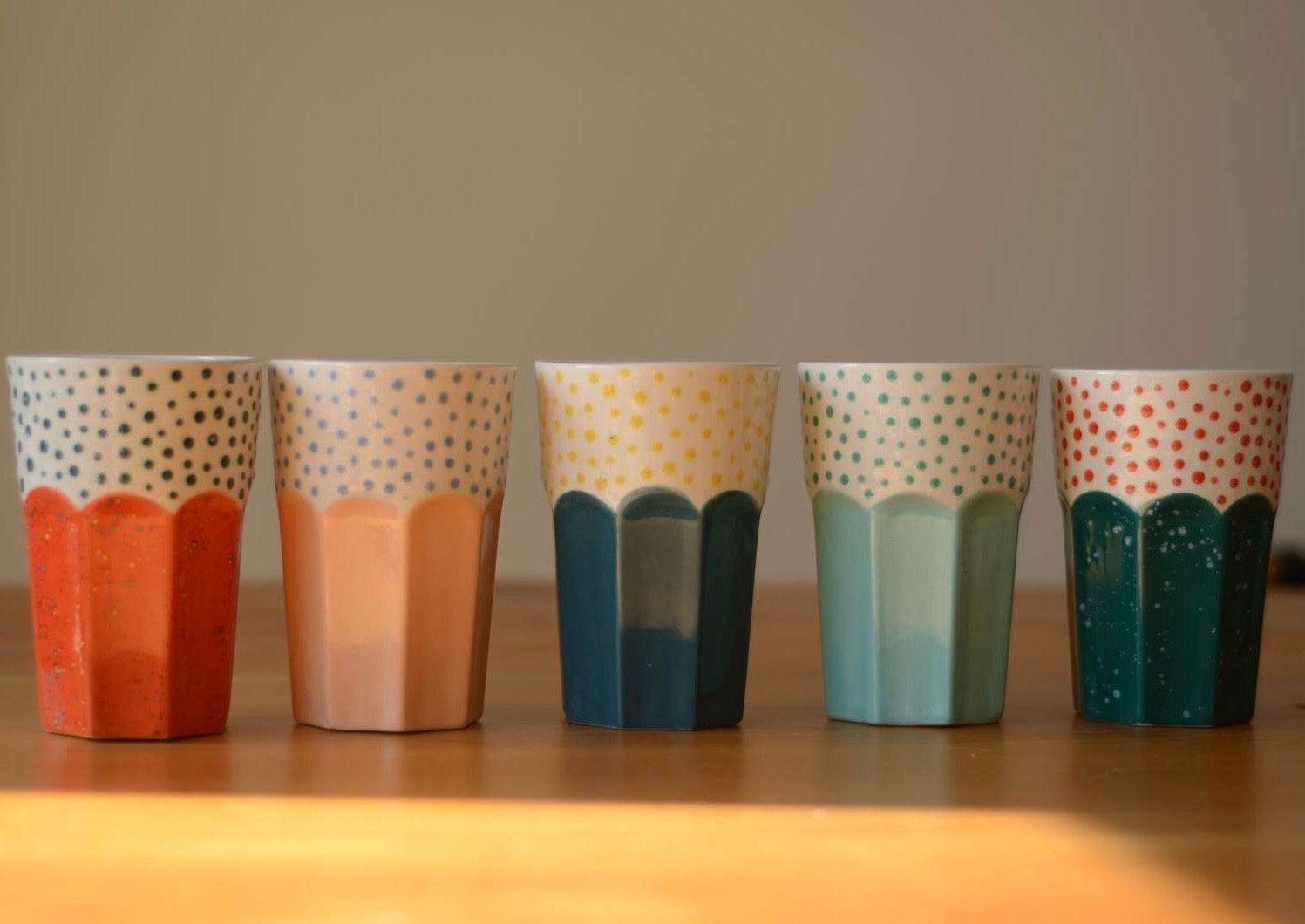 It's tall silhouette features allover sweetly femme dots without handle. The perfect addition to any kitchen and makes a great gift. Handmade ceramic mug glazed.