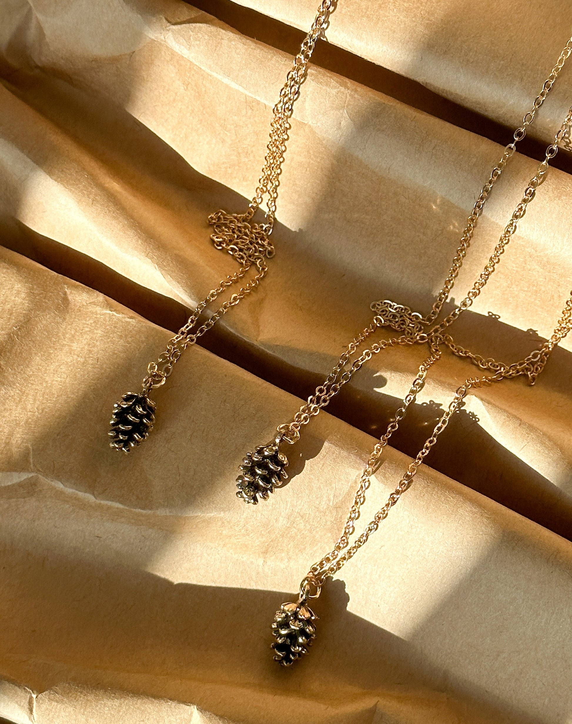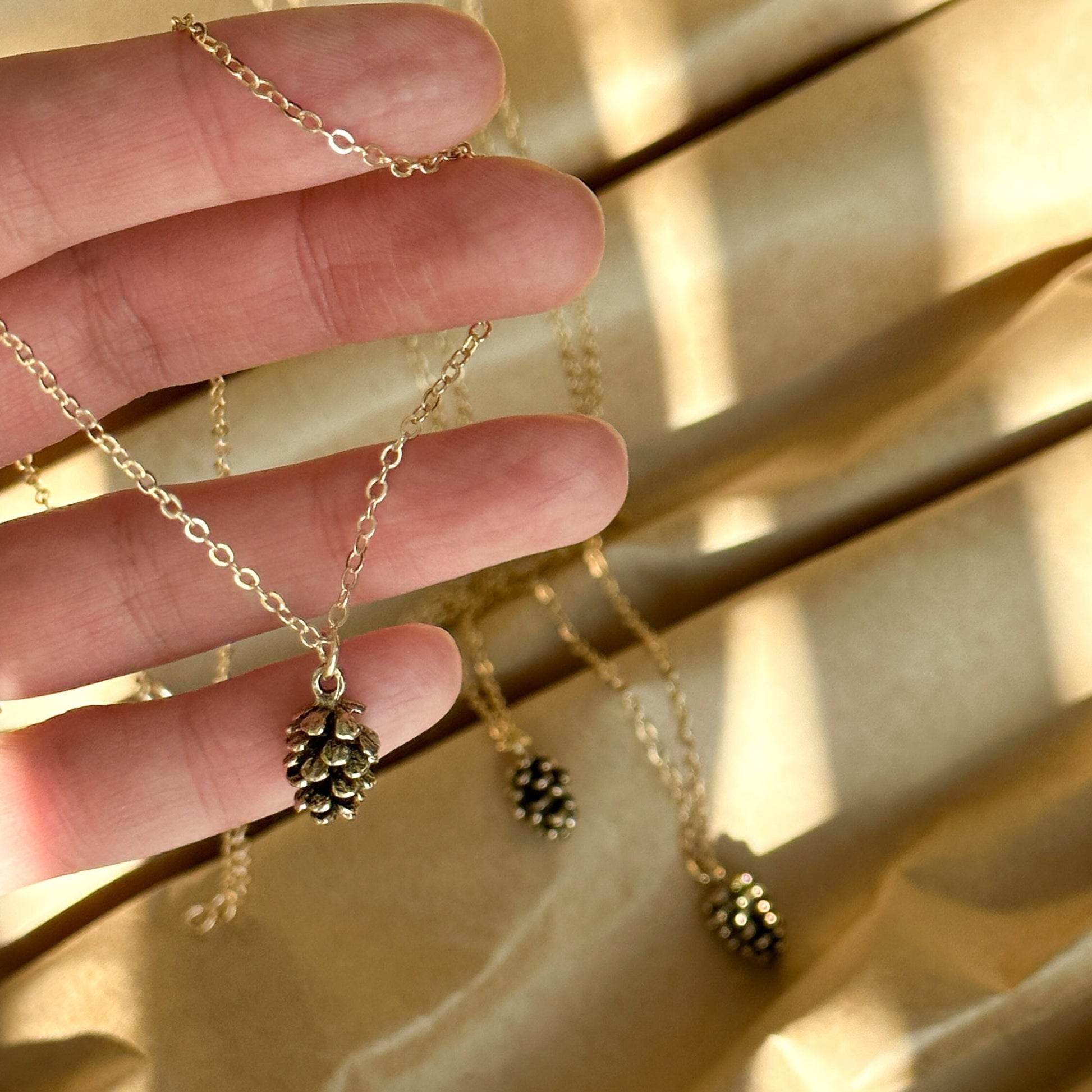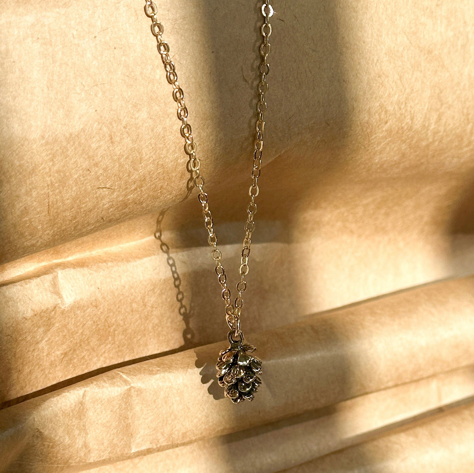 Beautiful and lovely pine cone charm necklace made of gold pinecone charm with skinny gold plated brass chain. Simple and cute looking dainty necklace is good for yourself or gift! Your necklace will ship in a premium sheer gift bag.