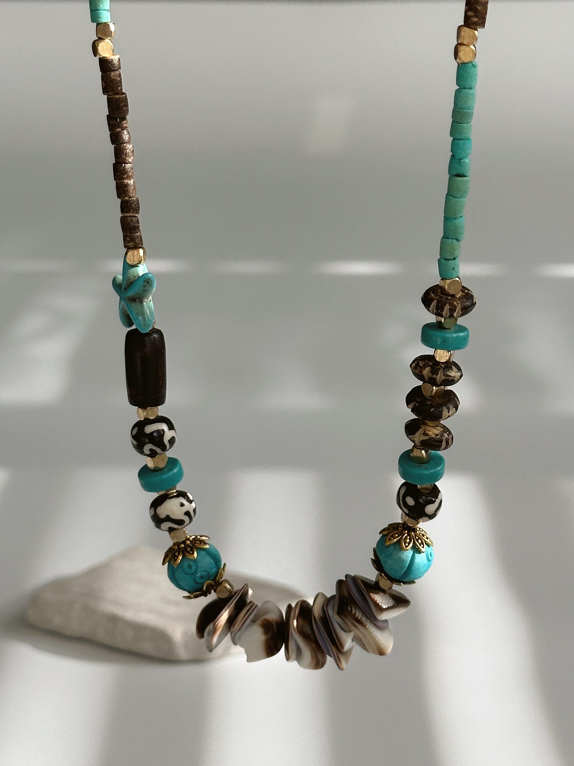 Its ethnicity and elegance comes from the traditional tribal ethnic design and boho minimalist string structure. It is designed and produced by local shaman artisans. Shamanism is known as a nature worship belief. Shamans bound their soul with nature. Our necklace is designed and is became alive with this bound.