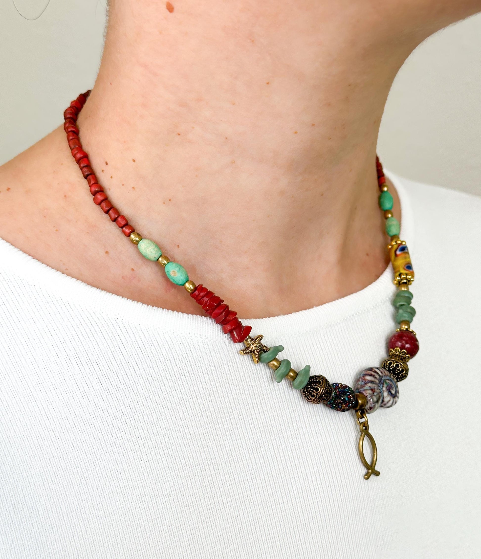 Its ethnicity and elegance comes from the traditional tribal ethnic design and boho minimalist string structure. It is designed and produced by local shaman artisans. Shamanism is known as a nature worship belief. Shamans bound their soul with nature. Our necklace is designed and is became alive with this bound.